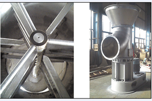 底部強(qiáng)化器設(shè)計獨(dú)特,攪拌齒為菱形,其流線性能使風(fēng)阻達(dá)到最小,設(shè)置在圓錐形料斗內(nèi),分動刀和定刀,粉碎效果顯著,使下落的結(jié)塊物料迅速粉碎為適合氣流干燥的粉粒料,攪拌的另一個主要作用是分散物料,加大了與料斗下面進(jìn)來的高速熱風(fēng)的接觸面積,于是料斗區(qū)形成了一個強(qiáng)烈傳熱傳質(zhì)的流化床,大部分濕分在料斗區(qū)被干燥。隨著干燥的進(jìn)行,變輕變細(xì)的干料受氣流作用明顯,與氣流一起上升并進(jìn)一步干燥,最后從干燥塔頂部出來進(jìn)入物料收集系統(tǒng)。